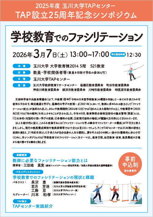 以上を総合的に捉え、これらを実装するには「ファシリテーションを学ぶ機会やファシリテーターの養成」が不可欠と考えます。しかし、現行の教員養成課程や教員研修等では十分とは言えないでしょう。そこでTAPセンターでは25年間の研究と実践を踏まえ、21世紀市民として子供たちが自分自身の人生を開拓し、夢を叶えるまでの険しい道のりを積極的に歩んで行くために、本シンポジウムでは「学校教育でのファシリテーション」をテーマとし、教育行政、幼児教育・保育、教員養成の立場から喧々諤々する機会とし、開催いたします。